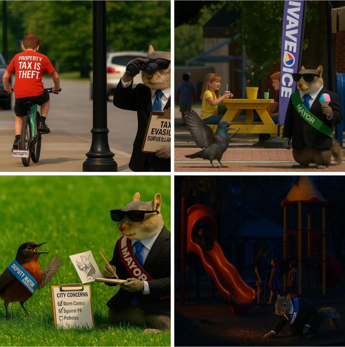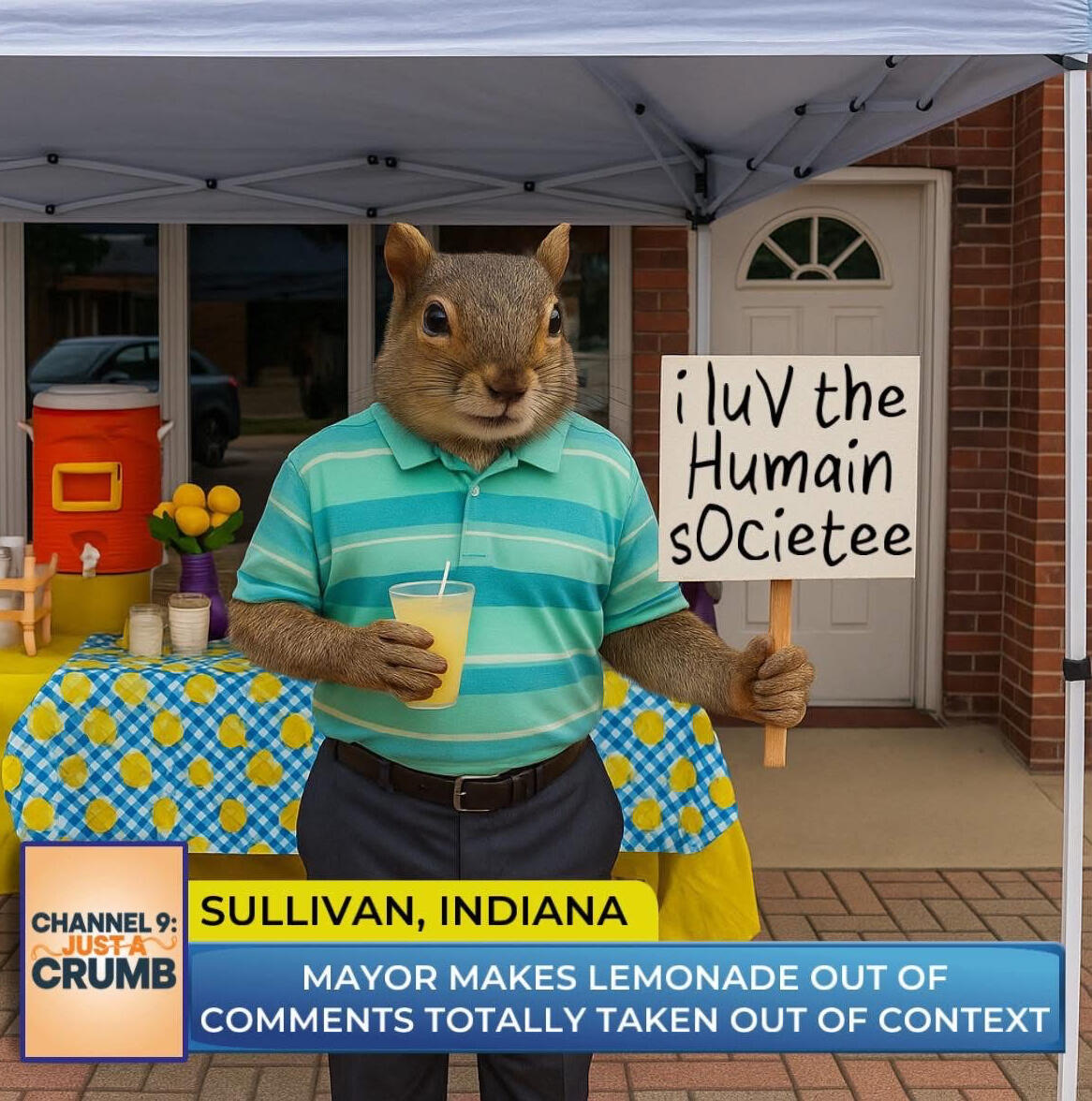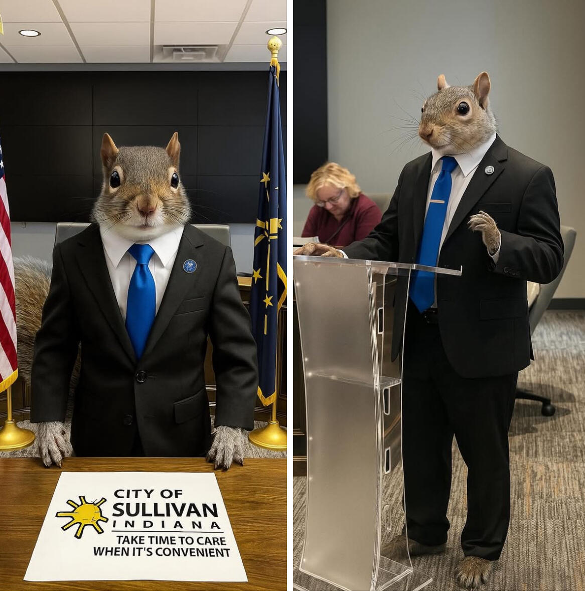 With no family beside him (because he bit them all), Mayor Nibbles proudly took the oath of office with trembling paws and an uneaten peanut in his mouth.His campaign slogan, “I can’t be worse than the last guy,” resonated so deeply with voters that he won by a landslide - though some have now claimed that their vote was stolen from them against their will. 🗳️While there may be disagreements in the community, Mayor Nibbles believes in climbing toward progress, gnawing through red tape, and always hissing when startled.Mayor Nibbles thanks the people of Sullivan for their trust, their easily accessed trash cans, and their unwavering support as he leads the city with zero experience and zero tolerance for ribbons that aren’t walnut flavored.Here’s to a new era of government, a better era of government. 🐿️#PieCity #JuicedByJoink #ChatGPTRunsThisPageToo #SullivanINNews #Satire