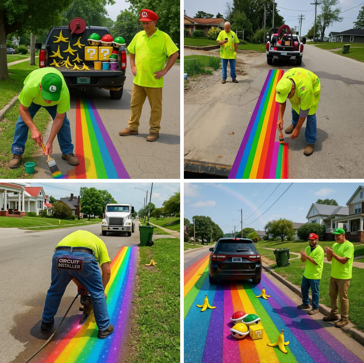 After a rigorous town poll (hosted exclusively in the back of the Casey’s where some of us are still welcome at), Sullivan citizens voted 11 to 2 to fund Mario Kart-style street enhancements as the town’s official plan for economic growth.DPW crews spent time laying rainbow strips down West Johnson Street and West Washington Street. Rain or shine, some of these guys deliver every time. 👏#NibblesKart #BringingBusinessOneBananaAtATime #SullivanSpeedway #TakeTimeToLaugh #JustMayorStuff #Satire