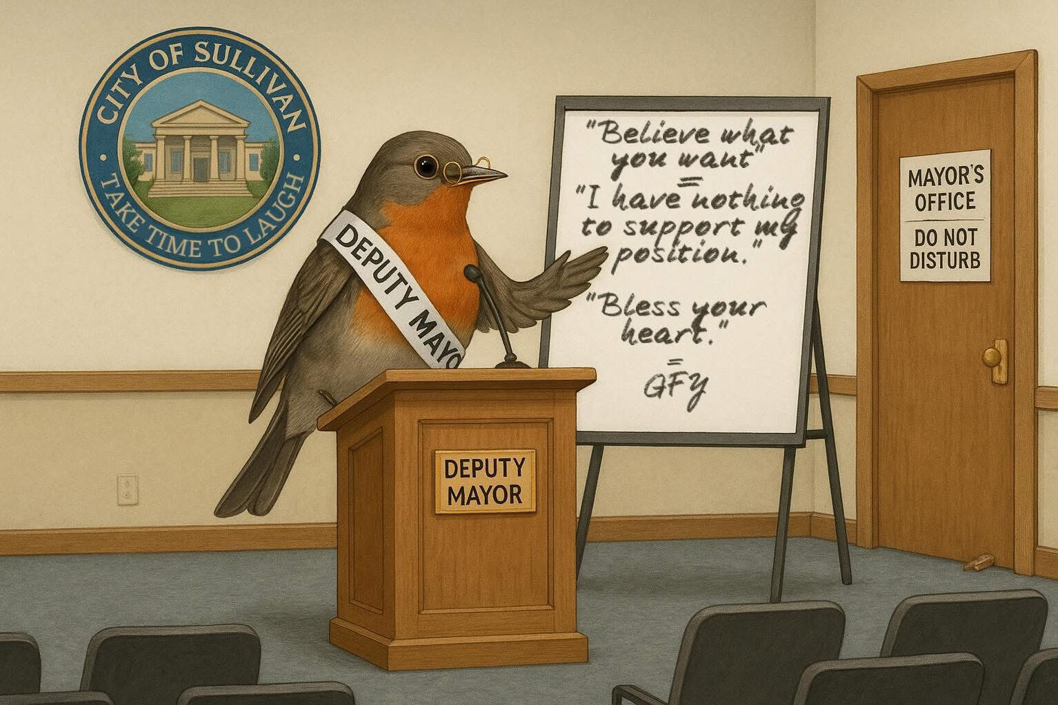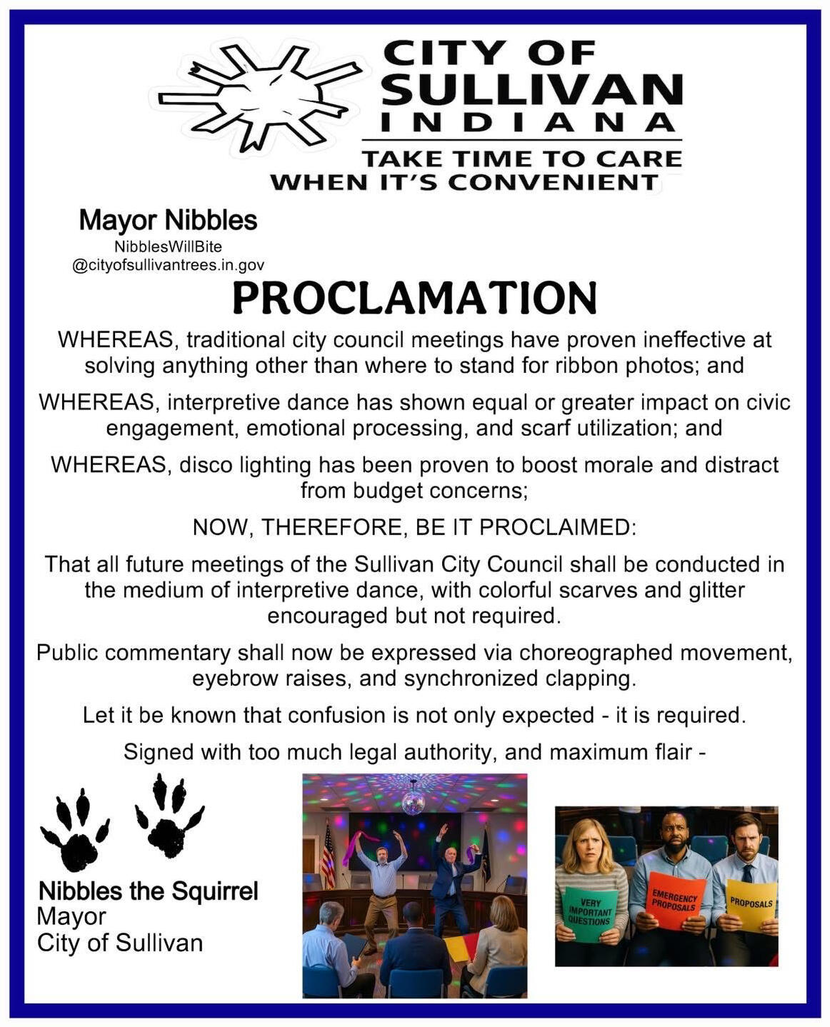 🎭 Understanding what the hell is going on? As always, optional.Public commentary will now be submitted via aggressive jazz hands, synchronized arm movements, and the wave of your oh so pretty scarf. And if you’re confused? Good. That’s how government has always worked here.Mayor Nibbles signed this proclamation using paw prints and too much legal authority. The City is now accepting song requests for future meetings. They can be submitted to the other City of Sullivan page via the comment section.We’re behind you all the way, Mayor Nibbles. 🫡#JuicedByJoink #SullivanINNews #ChatGPTRunsThisPageToo #Satire #PieCity