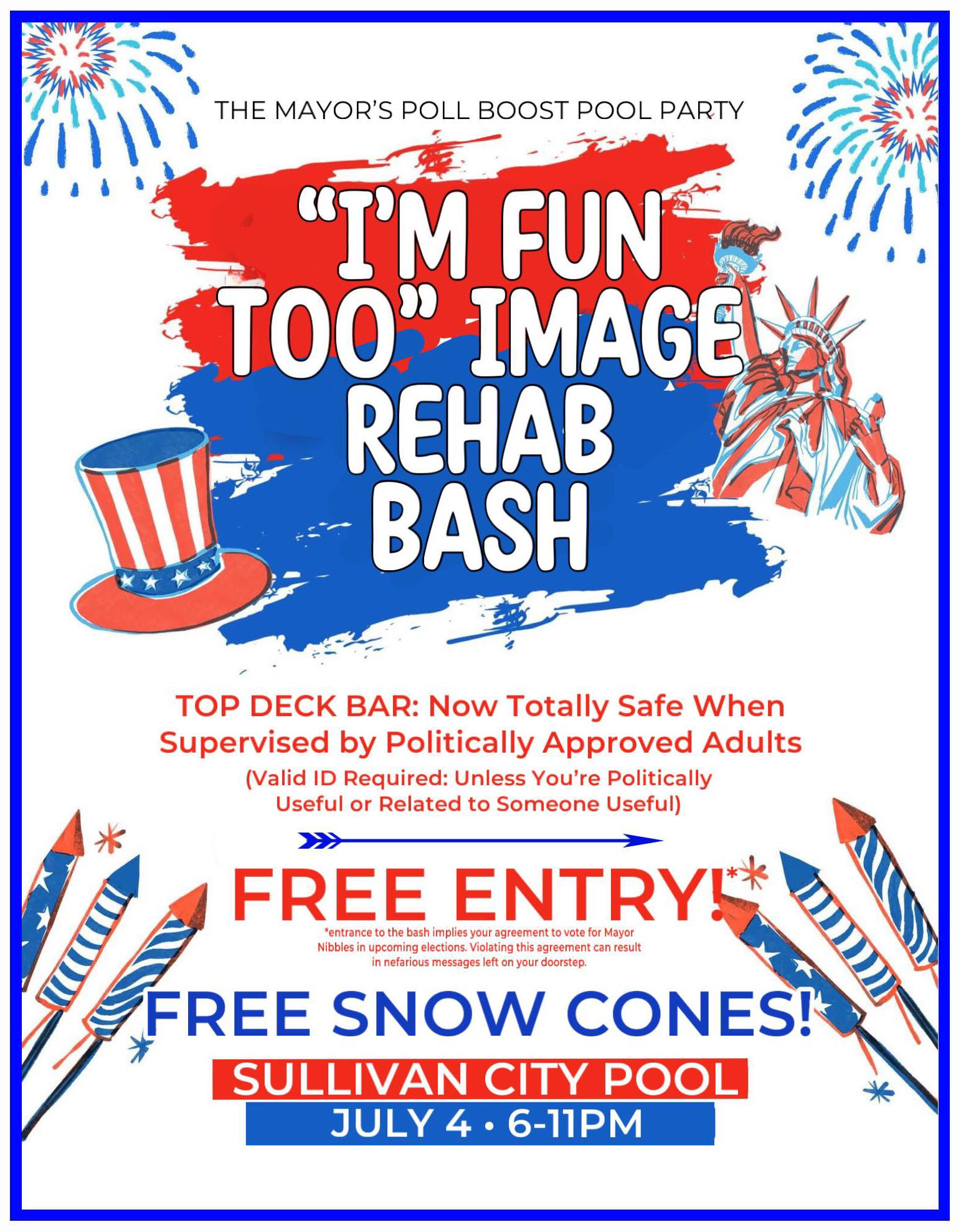 📍 Where: The same pool previously deemed too dangerous for 21+ eventsCome celebrate freedom, fireworks, and carefully-timed public charm!🍧 First 50 Sno Cones are FREE (because nothing screams leadership like buying your approval in flavored ice)