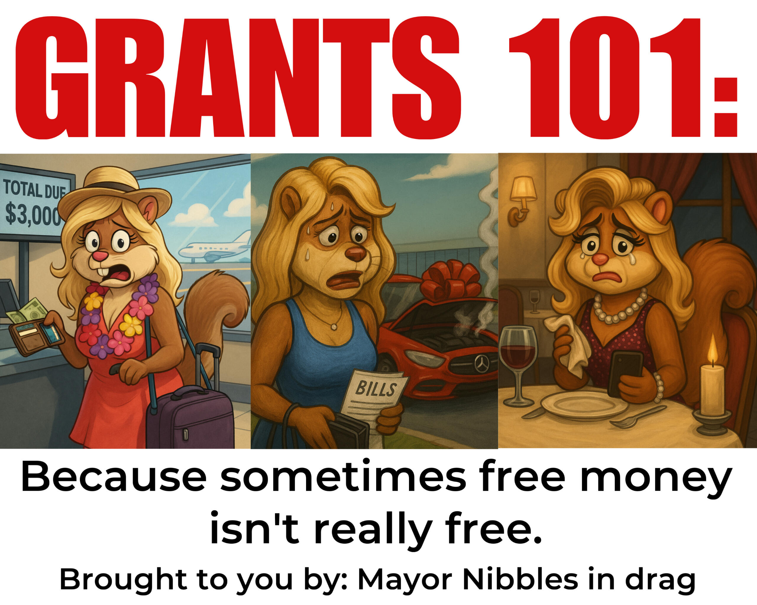 They look good on paper, Facebook loves them, but they’re high maintenance, full of conditions, and those dark pink flags end up just being red.Howdy, kids! Mayor Nibbles here to host an important TED Talk because the word ‘grant’ gets thrown away more often than ‘slander’ here lately. Let me just slip into something more comfortable…Puts on a dress and wig“Welcome to: GRANTS 101 BUT COMPARED TO ALL YOUR EXES!”🚶Matching Grant